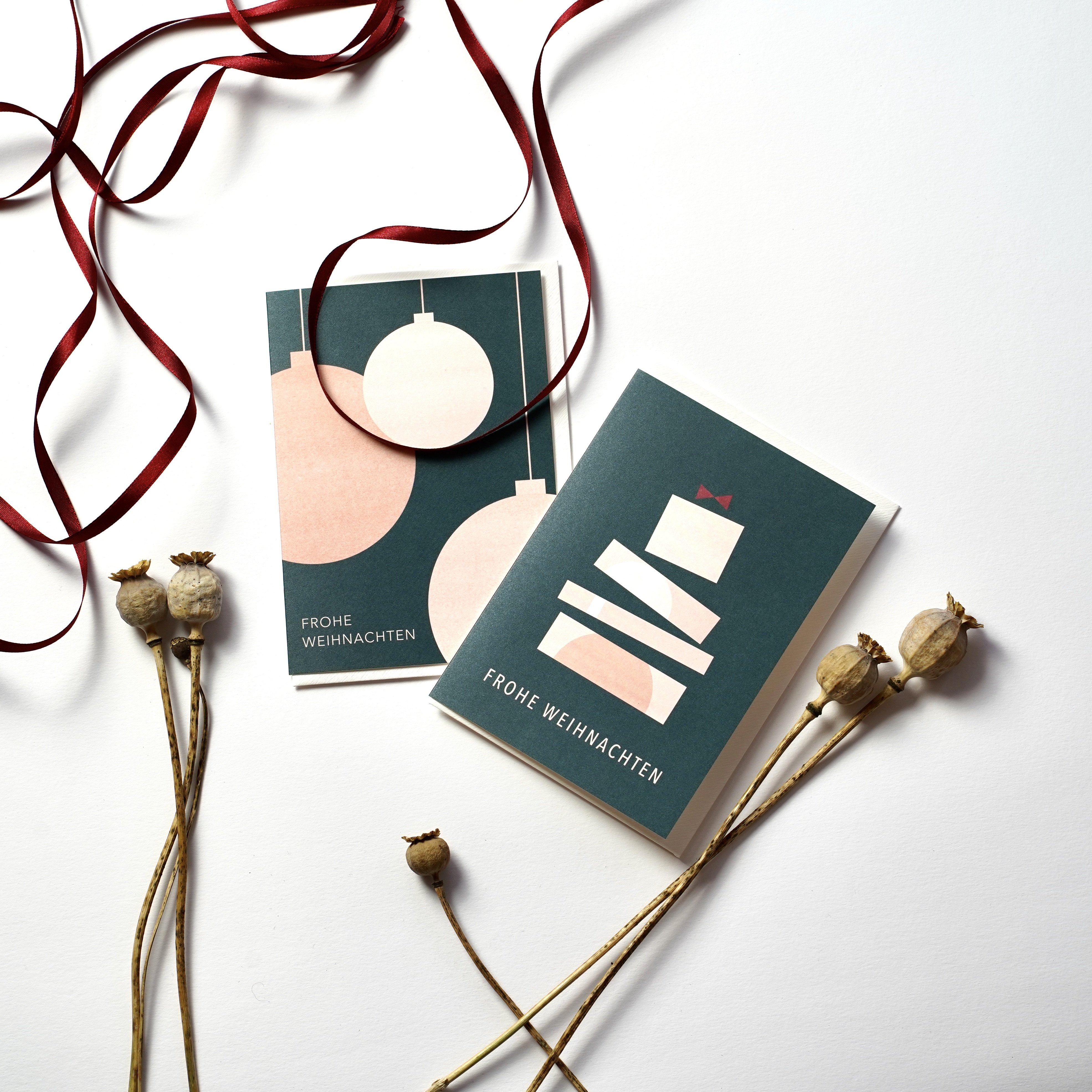 Bei den Motiven handelt es sich um die Weihnachtskarten "Geschenke Geschenke" und "Christbaumkugeln Rosa".