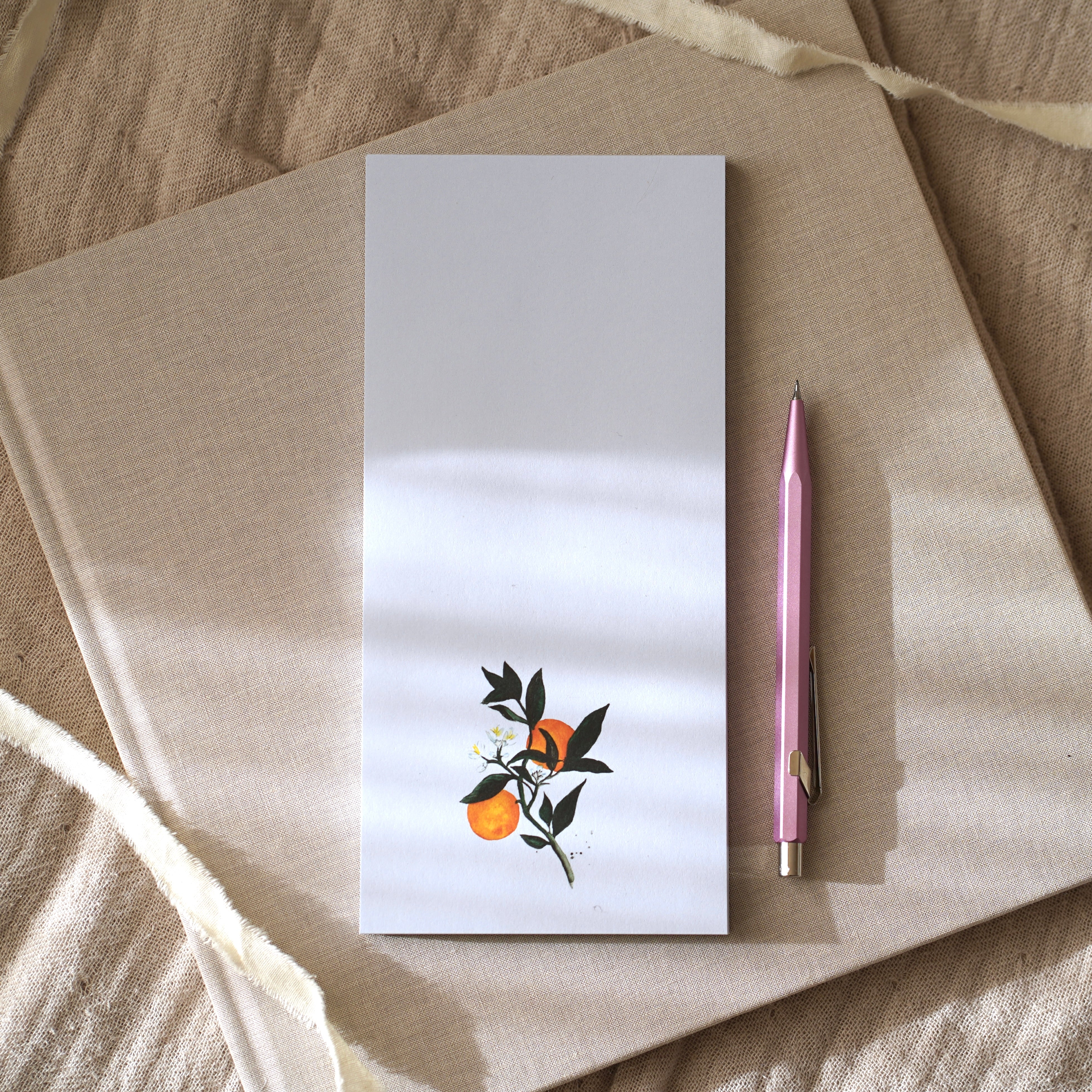 Der Notizblock Orange ist dein zuverlässiger Begleiter für Gedanken, To‑Do‑Listen, Skizzen und spontane Ideen – kompakt, kraftvoll und handwerklich geprägt. Jede Seite trägt eine zarte handgemalte botanische Illustration auf blauem Hintergrund, die den Schreibfluss inspiriert, ohne abzulenken.