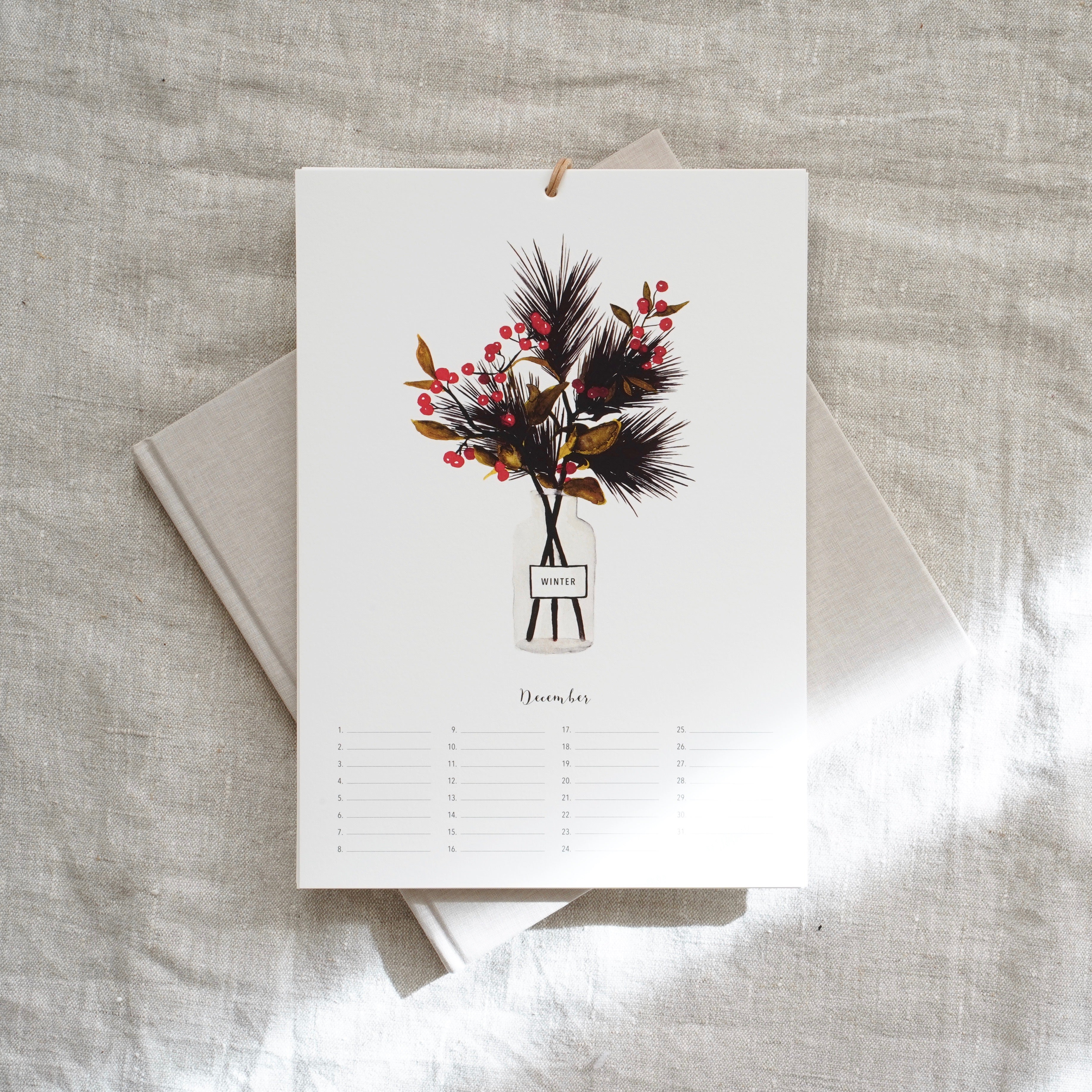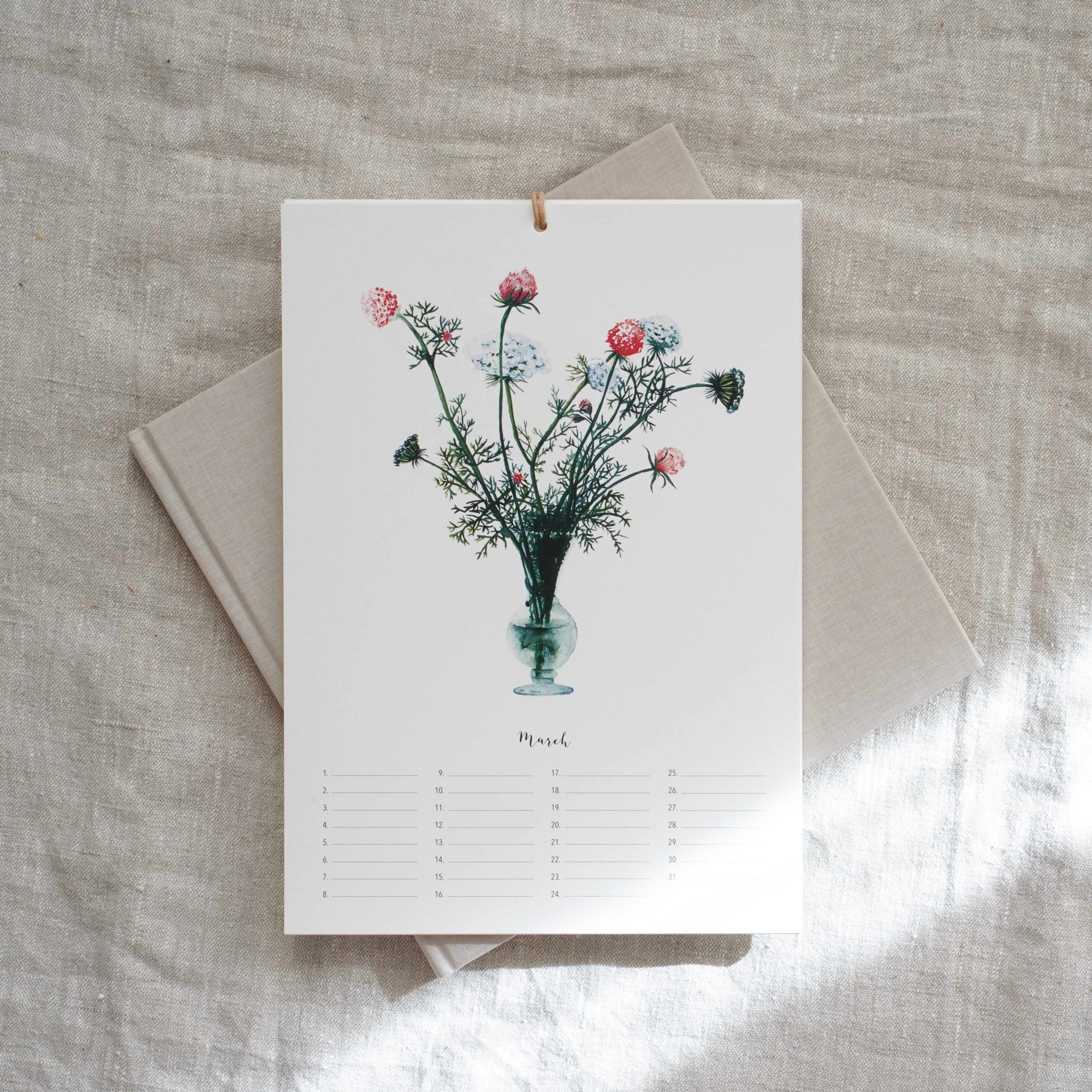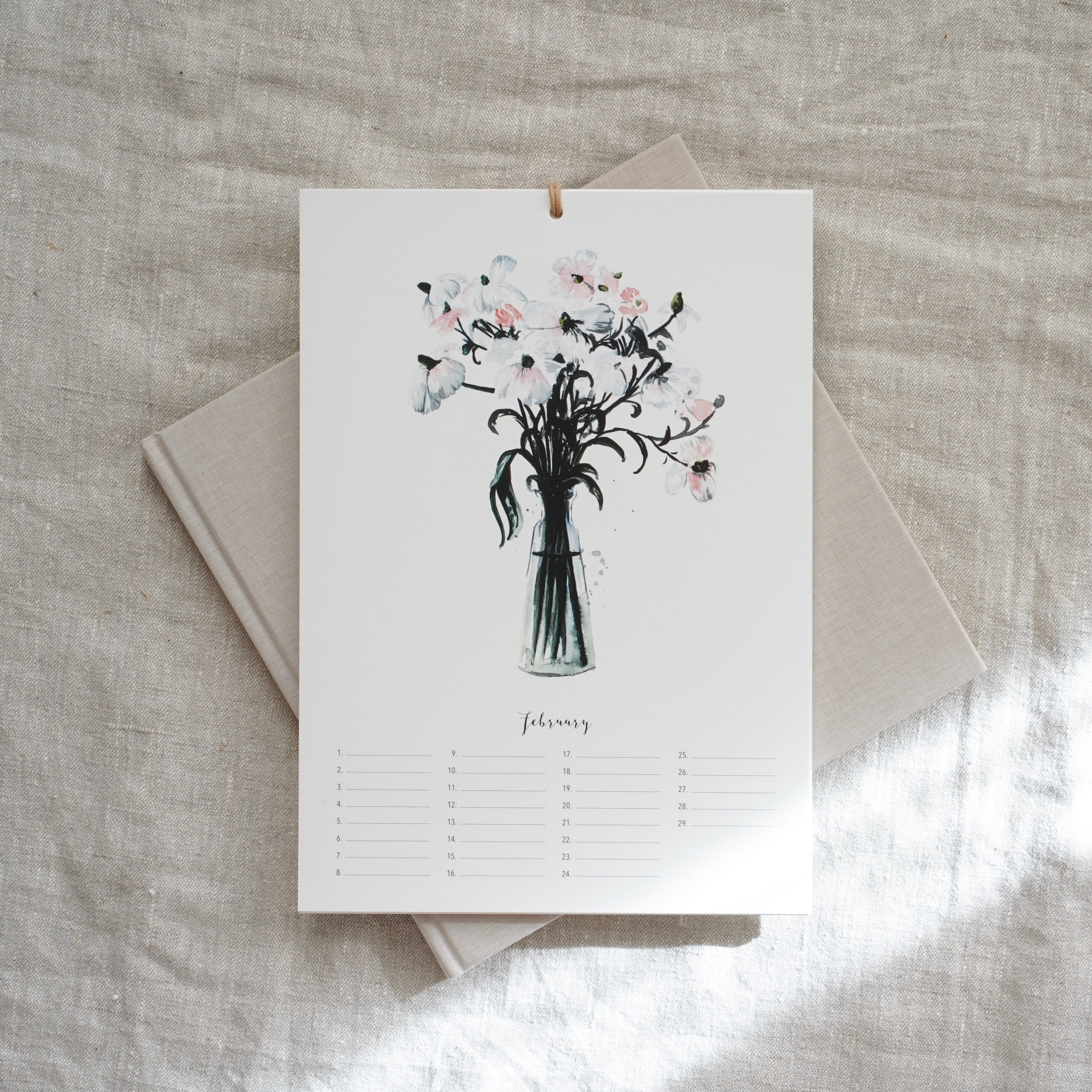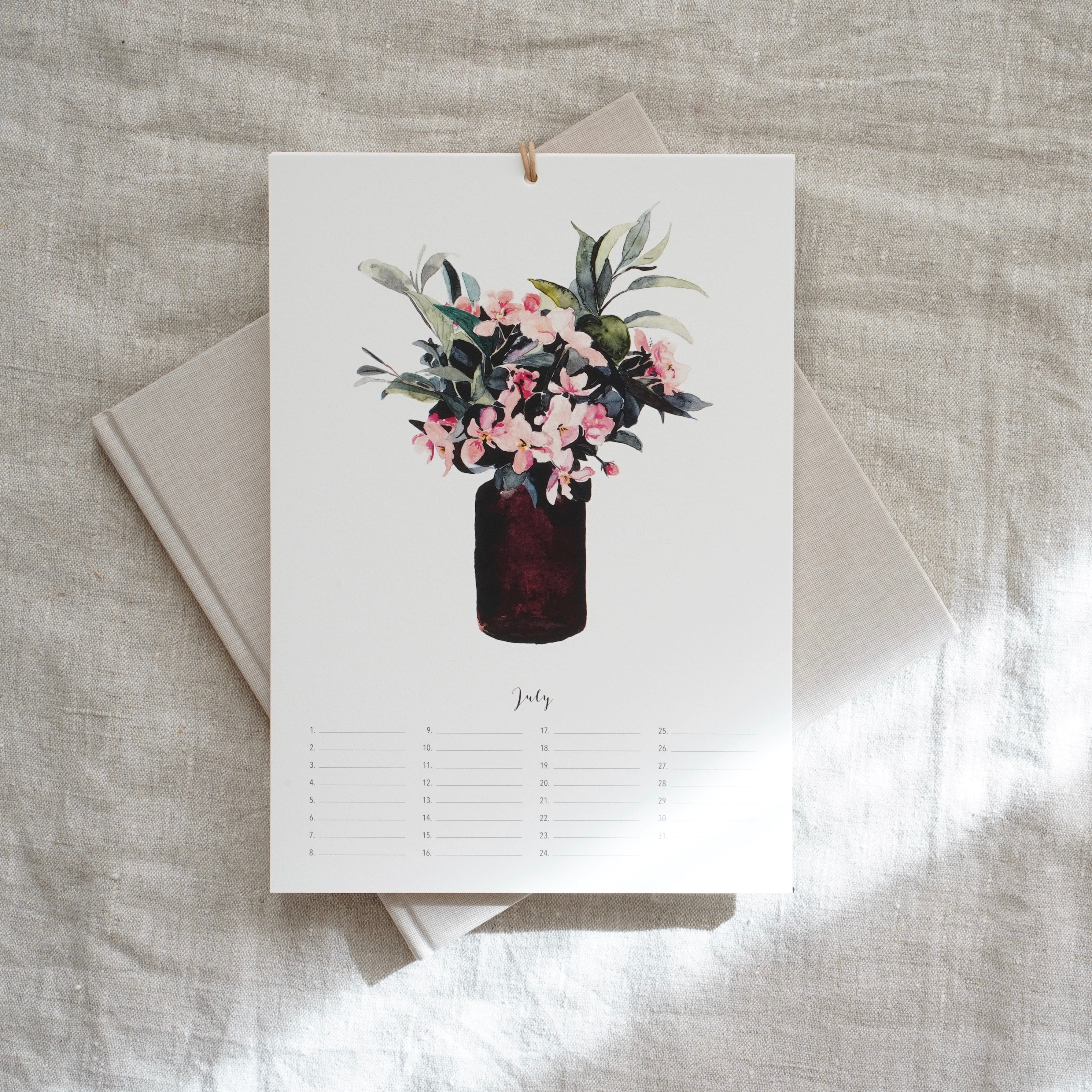 Mit 12 liebevoll von Hand gemalten Aquarell-Illustrationen zum Thema Blumen wird jeder Monat zu einem farbenfrohen Kunstwerk und erinnert an die Schönheit der Natur. Die Blumensträuße spiegeln die verschiedenen Jahreszeiten in ihrer Farbgebung wider.